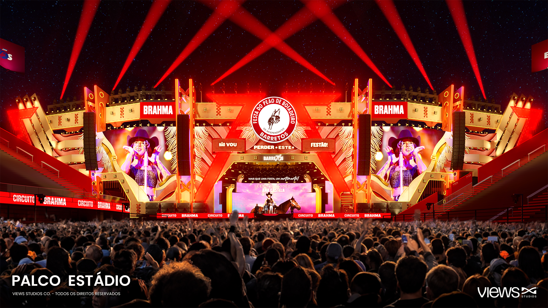 O trabalho assinado pela Views, pelo terceiro ano responsável pela execução técnica e cenográfica, envolve o Palco do Estádio de Rodeios, o Palco Amanhecer, os portais de entrada do Parque, da Arena e do estacionamento, além do Jumbotron, um telão de quatro faces suspenso no centro da arena, e o Palco 360º, localizado no Estádio. Cada estrutura foi pensada para ser parte da narrativa do evento e criar um design de experiência, valorizando as competições, os shows e a da marca com o público.