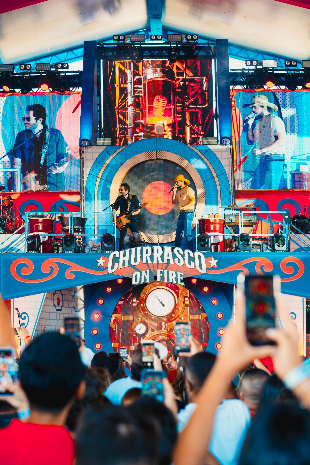 O Churrasco On Fire tem o maior palco itinerante da América Latina, composto por 12 espaços distintos distribuídos estrategicamente. Não há palco principal fixo. A proposta é criar proximidade e mobilidade, permitindo que a apresentação aconteça em diferentes pontos do espaço. O show tem início a mais de 10 metros de altura e se desenvolve em uma estrutura móvel, com ativações e conexões entre palcos ao longo das três horas de apresentação.