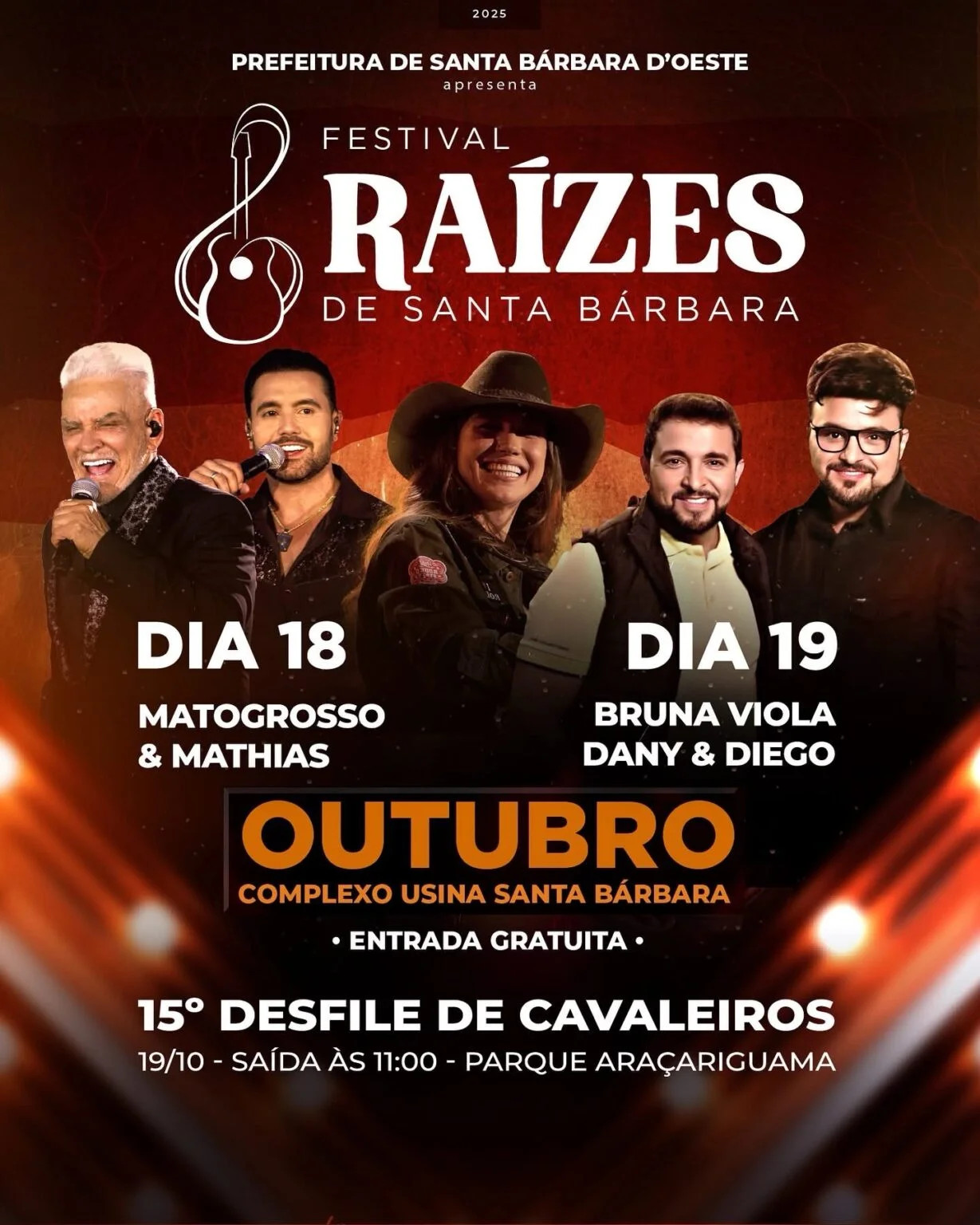 O 15º Desfile de Cavaleiros e Muladeiros integra a programação do Festival Raízes de Santa Bárbara 2025, que será realizado nos dias 18 e 19 de outubro. O evento terá shows principais de Matogrosso & Mathias (18) e Bruna Viola (19), além de artistas da cidade e região.